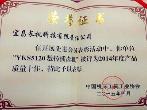 4月20日中國(guó)國(guó)際機(jī)床展覽會(huì)上,公司YKS5120數(shù)控插齒機(jī)獲中國(guó)機(jī)床工具工業(yè)協(xié)會(huì)授予的“2014年度產(chǎn)品質(zhì)量十佳”榮譽(yù)。