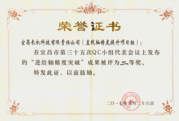 公司直線軸精度提升項(xiàng)目組在宜昌市第三十五次QC小組代表會議上發(fā)布的“進(jìn)給軸精度突破”成果被評為二等獎。